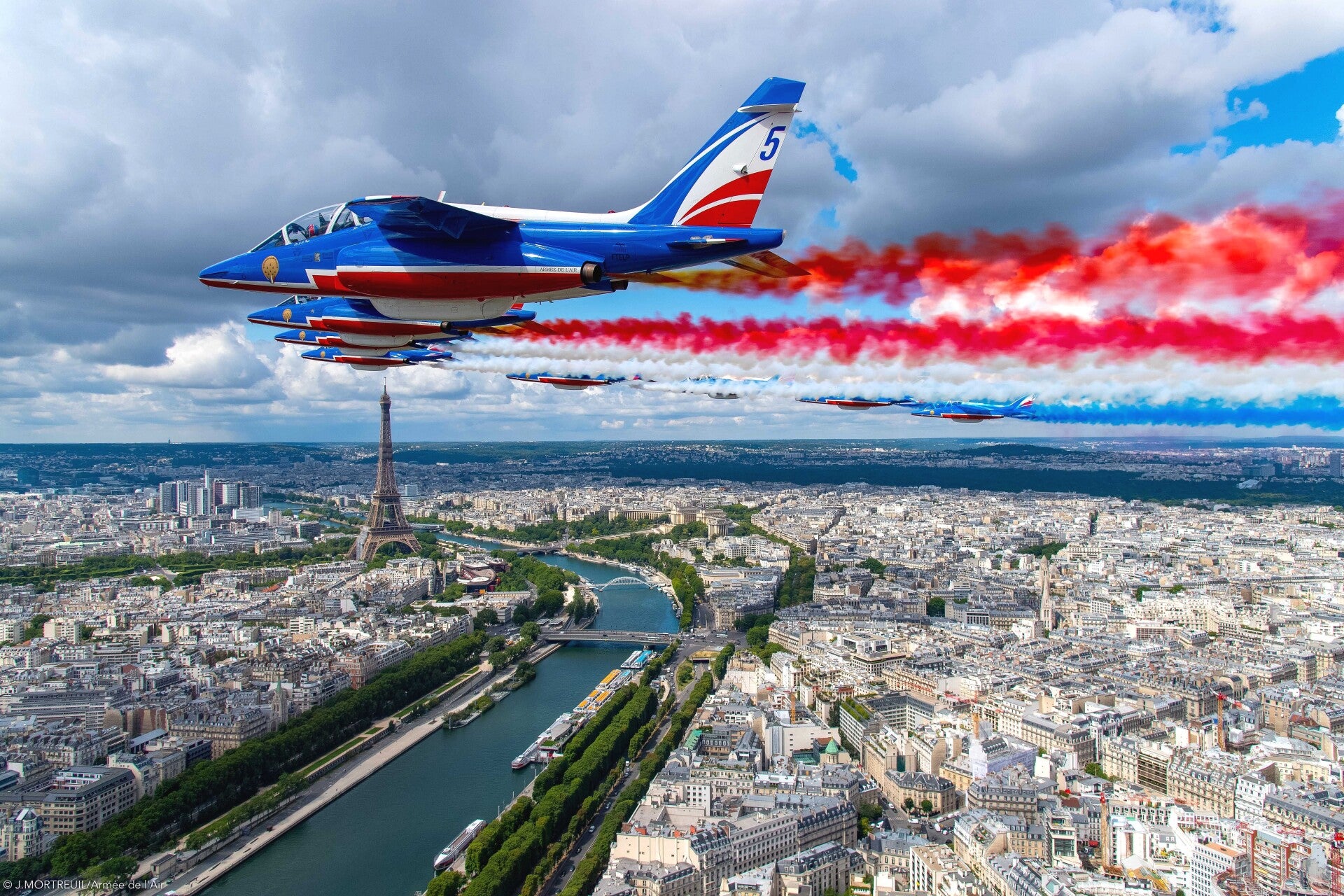 La Patrouille de France (la P.A.F) ouvre traditionnellement le défilé du 14 Juillet à Paris, dont l'équipe est composée de 9 Pilotes/Athos en Alpha Jet (Athos : nom de code radio des pilotes pour communiquer en vol).